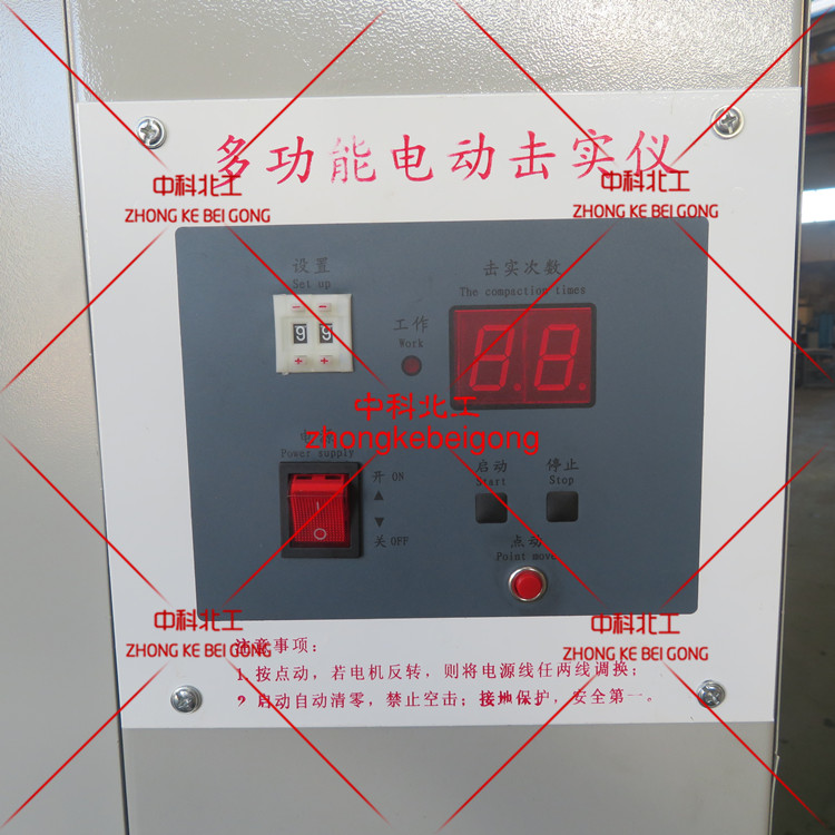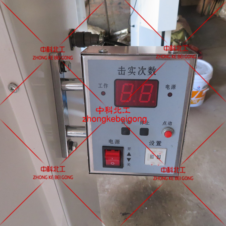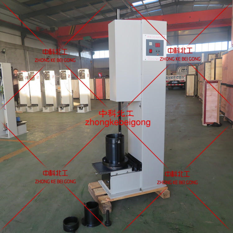 根據(jù)使用試模的內(nèi)徑大小,可以將工作臺前的M16螺栓的鎖緊螺母先松開后,將落錘放入試桶內(nèi),然后調(diào)整M16栓,調(diào)制錘的外徑與試筒內(nèi)徑,相應(yīng)的距離即可,然后將M16螺母鎖緊,開機(jī)前先用人工提放一下齒條,確認(rèn)試桶邊緣不受擊實為準(zhǔn),方可開機(jī)工作。