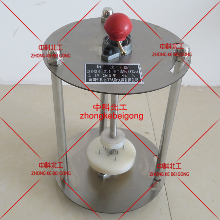 將土樣置于兩釘盤(pán)之間,轉(zhuǎn)動(dòng)中軸,用切土刀或鋼絲鋸。沿著所需直徑面邊轉(zhuǎn)邊切,即可切成所需土樣柱。