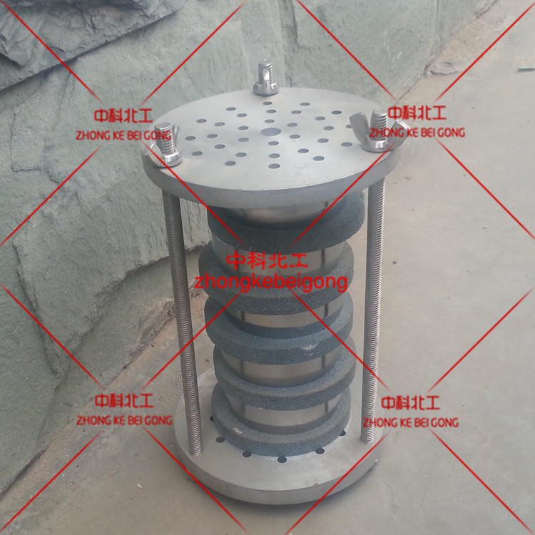 將試樣放入環(huán)刀內(nèi)填滿。上下兩面刮平。并貼上濾紙,放在兩塊透水石中間,將五個(根據(jù)需要可少于五個)試樣疊放,用蝶型螺母將透水石、環(huán)刀夾緊。
