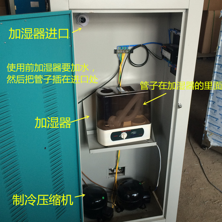 3、打開箱體側(cè)門,把加濕器安裝在托板上裝上,加濕機接頭并和箱內(nèi)進氣管接好,插上電源插頭。